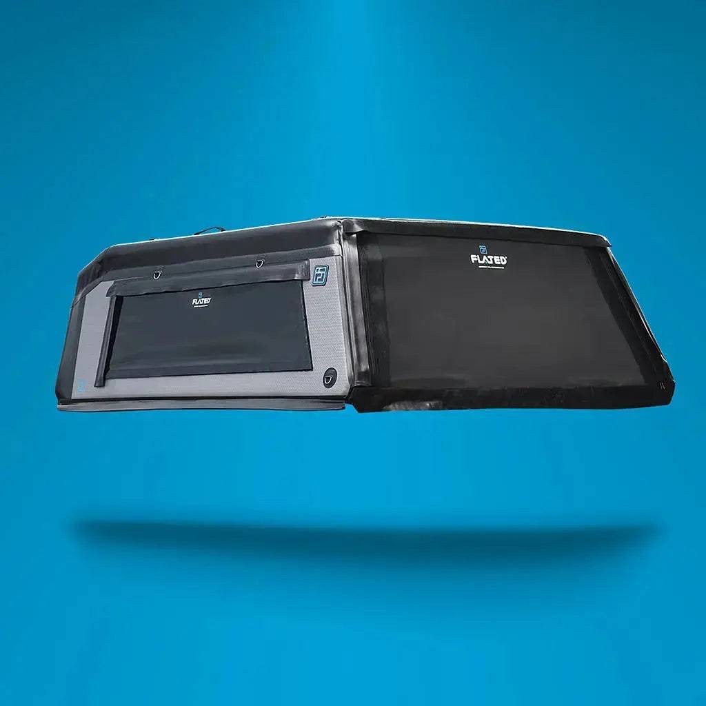 The Flated Air-Topper is an inflatable, collapsible truck bed cap designed for pickups, such as the Rivian R1T (using the Maverick size). Flated is the only company currently offering a compatible topper for this vehicle. The topper is lightweight, easy to install with no permanent modifications, features high quality materials for durability and rigidity, is water resistant, and can be easily inflated using a manual pump or the Rivian's onboard compressor (with adapter). It is primarily designed for overlanding and camping, offering quick shipping and excellent customer service from Flated. Its innovative inflatable design allows for compact storage when not in use.