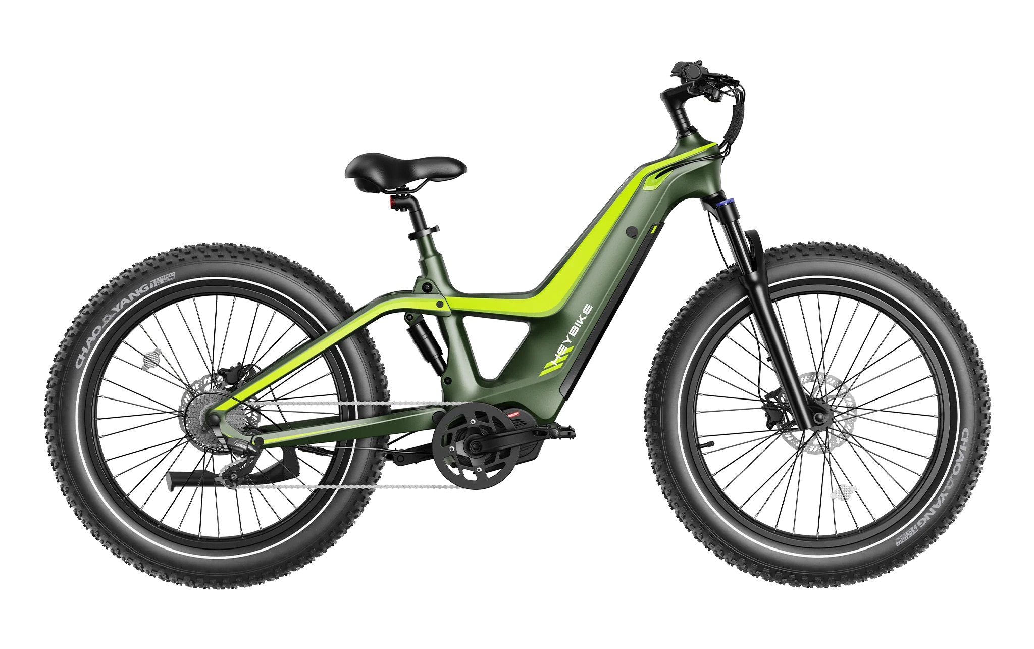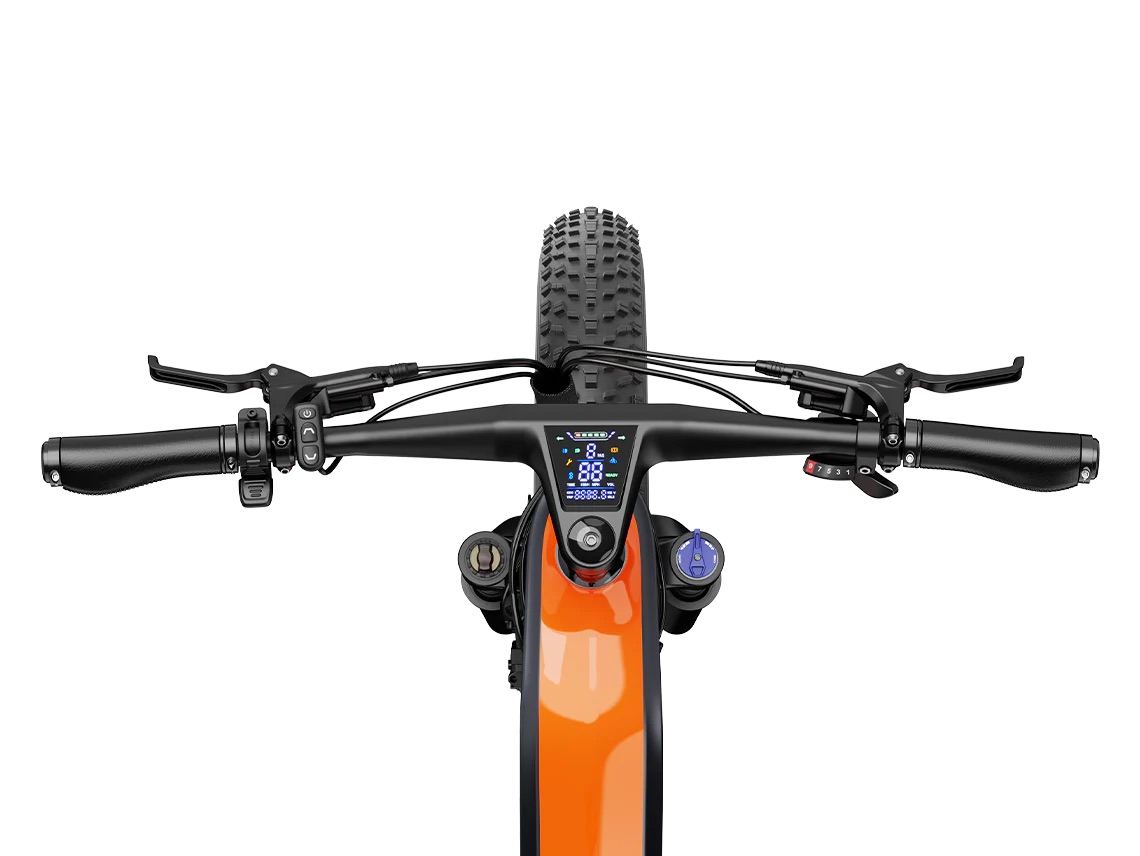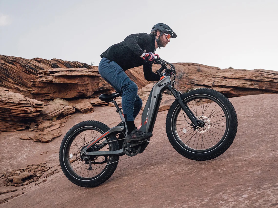 The Heybike Hero is a high-performance, all-terrain e-bike built with a lightweight T800 carbon fiber frame designed for durability and vibration absorption. It is available in two powerful motor configurations: a 750W mid-drive motor delivering a massive 160 Nm of torque or a 1000W rear hub motor providing 100 Nm of torque. Powered by a 48V 18Ah (864Wh) UL-certified battery, the Hero offers a range of up to 60 miles and can reach a top speed of 35 mph. For superior ride quality, it features a full suspension system with a hydraulic front fork and rear shock, paired with 26" x 4" puncture-resistant fat tires. This model is equipped with Shimano gearing (8-speed for mid-drive, 9-speed for hub), hydraulic disc brakes for precise stopping power, and a sleek integrated handlebar display. With a 400 lb payload capacity and unique styling, the Hero balances strength and agility for both rugged trails and daily commutes.