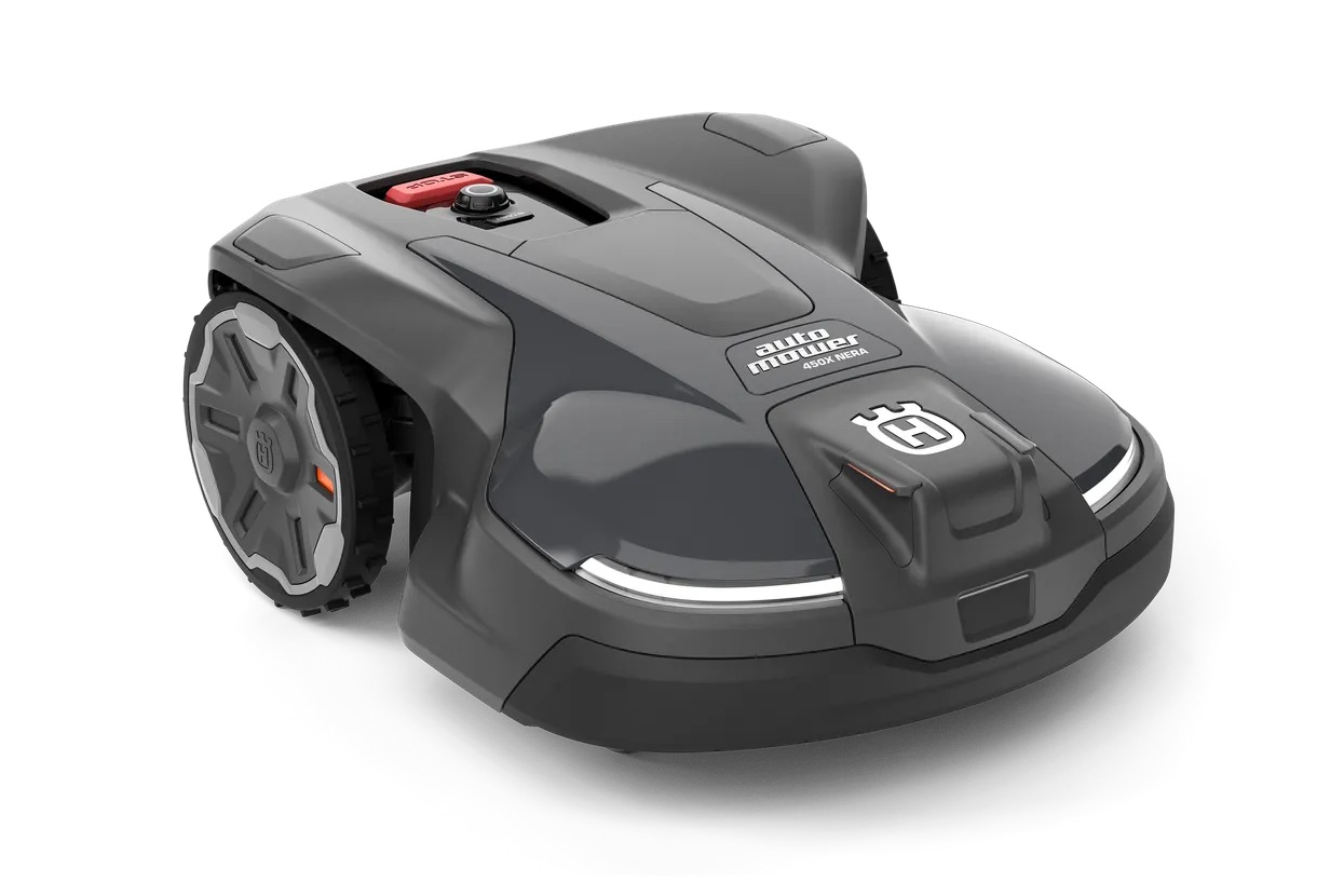 The Husqvarna Automower 450X NERA is a robotic lawn mower designed for large-scale maintenance of areas up to 5,000 m² and is capable of navigating slopes with an incline of up to 50%. A primary feature of the NERA series is its compatibility with the Husqvarna EPOS Plug-in Kit, an optional accessory that enables satellite-based navigation for wire-free virtual boundaries with a reported precision of 2–3 cm. The unit utilizes a cutting system composed of three pivoting razor blades with an adjustable cutting height ranging from 20 to 60 mm. For obstacle management, the 450X NERA is equipped with built-in radar technology to detect and avoid objects on the lawn, supplemented by GPS-assisted navigation and 4G/Wi-Fi connectivity via the Automower Connect app. Operational technicalities include the TargetHeight function for automated cutting height reduction, a weather timer that adjusts mowing frequency based on grass growth, and a 195-minute typical mow time per 40-minute charge cycle. The mower weighs 15.0 kg and maintains a measured sound level of 60 dB(A).