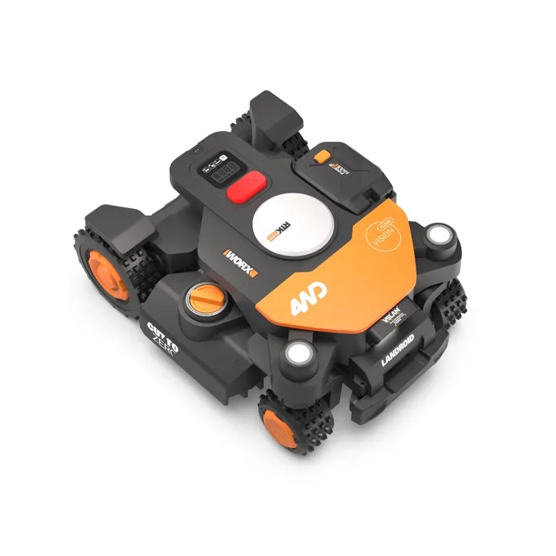 The Worx Landroid Vision Cloud 4WD (WR344) is an autonomous lawn mower designed for properties up to one acre, utilizing an onboard HDR camera and a neural network to navigate without the need for boundary wires or RTK base stations. This specific 1-acre 4WD model is engineered for complex terrains, featuring an all-wheel-drive system capable of managing slopes up to 24° (45% grade). The unit employs a three-blade cutting system with an 8.5-inch cutting width and an electronically adjustable cutting height ranging from 1.5 to 3.5 inches. For obstacle management, the Vision system identifies and avoids non-grass objects in real-time, while integrated LED headlights allow for nocturnal operation. Technical specifications include a 20V 5.0Ah PowerShare battery, Wi-Fi and Bluetooth connectivity, and a "Cut-to-Edge" design intended to minimize manual trimming along borders. While the Landroid Vision series includes several models with varying area capacities and drive systems, these specifications refer specifically to the 1-acre 4WD configuration.