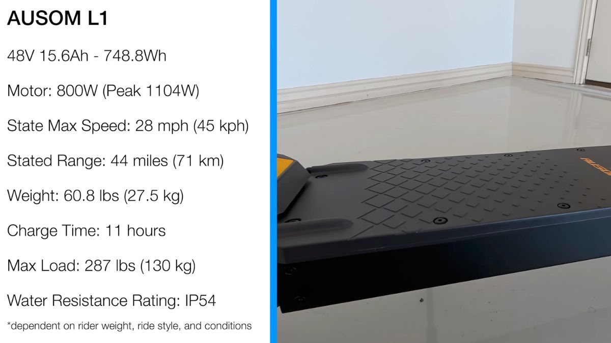 The Ausom L1 is an electric scooter that utilizes an 800W motor with a peak output of 1104W and a 48V 15.6Ah battery system. This setup enables a maximum speed of 28 miles per hour and an estimated range of up to 44 miles per charge. The structure is composed of high strength STL material and carries a net weight of 60.8 pounds while supporting a maximum load of 287 pounds. Ride comfort is managed by a dual swingarm suspension system and 10 inch tubeless tires. Stopping power is provided by front and rear disc brakes integrated with electronic braking assistance. The scooter includes security features such as NFC and password unlock and it has an adjustable handlebar to accommodate different rider sizes. It also features an IP54 water resistance rating and a comprehensive LED lighting system for operational safety.